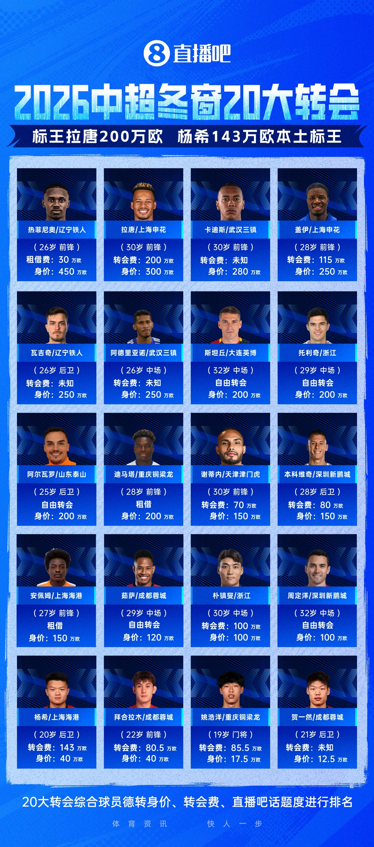 2026中超冬窗转会TOP20【注:数据参考德国转会市场网,20大转会综合球员德转身价、转会费以及话题度,排名依照德转身价从高至低】