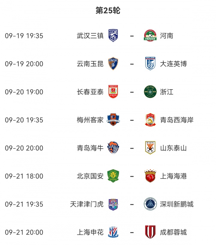 09月12日讯 中超第24轮先赛4场,海港4-2玉昆,蓉城1-0亚泰,国安0-2河南,申花3-3泰山!